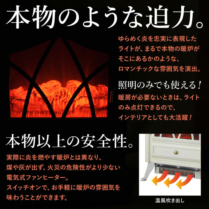 イルミネーション(炎の部分)は、 暖房とは、別のスイッチなので、暖房としてだけではなく、 照明器具、インテリアとしても使用OK! 扉を閉めれば操作部は隠れるので、デザインも損ないません 安全装置を搭載 「転倒時自動オフスイッチ」 本体の転倒時に自動でOFFになる 「温度過昇防止器」 本体が熱くなりすぎないようにする「温度過昇防止器」を搭載! 【商品詳細】 ・商品サイズ:約W40.3xH54xD25cm ・質量:約5.6kg ・カラー:ホワイト、ブラック ・電源:AC100V 50/60Hz ・消費電力:600/1200W ・電源コード:約1.5m ・機能:強/弱(2段階切替)、ヒーター調節、照度調節 ・安全装置:温度ヒューズ、転倒時自動オフスイッチ、温度過昇防止器 ・付属品:ドライバー ・保証期間:1年間 ・JANコード: ホワイト:4562351035644 ブラック:4562351035637 【使用上の注意】 ・差込プラグを抜くときはコードを持たずに、必ず先端の差込プラグを持って引き抜いてください。